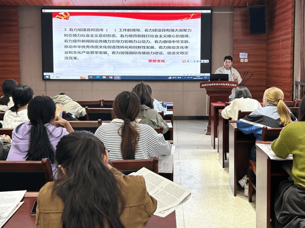 活动伊始,领学人通过播放视频素材向全体与会同学传达习近平总书记对宣传思想文化工作作出的重要指示精神,同学们认真观影并深入领会宣传思想文化工作的重要性。习近平总书记指出,坚定文化自信秉持开放包容坚持守正创新,为全面建设社会主义现代化国家,全面推进中华民族伟大复兴提供坚强思想保证强大精神力量有利文化条件。