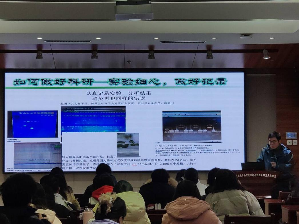 周奕轩介绍了本科到研究生阶段的个人经历,通过对甜瓜果实糖分积累的研究,确定了甜瓜糖分积累是由果实本身决定的。周奕轩从“大量阅读文献”、“细心实验与做好记录”、“勇于尝试”3个方面分享了他对于如何做好科研的看法。他讲到,首先,应多阅读文献,做好文献管理,带着思考去阅读文献;其次,应做好实验记录,只有良好的记录才能找到实验事变的原因;再次,要勇于尝试,改进他人实验中存在缺陷的方法,更好的应用于自身课题中;最后,周奕轩建议同学们要在科研之外寻找感兴趣的事,以调节自己的身心状态,更好地投入到科研工作中。