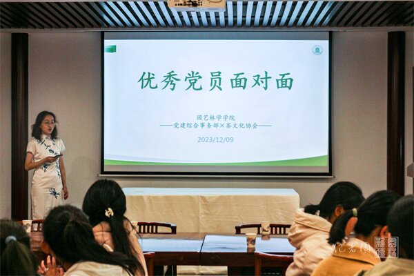 在茶香缭绕之中,交流会正式开始。“你们为什么会想要入党呢?”分享之前,潘志勇向参与交流的同学们提出了一个问题。园林2301班的徐歌同学分享道:“我想加入共产党是因为我从小就在电视和新闻里看到优秀党员的事迹,正是因为他们的熏陶,才让我有了想向党靠近的决心。”潘志勇对徐歌同学的回答表示了肯定,并展开分享了他的入党原因。他谈到,共产党有着优秀的组织平台和强有力的领导能力,这是他坚持入党的原因。随后,他结合疫情中共产党采用集中管理的模式,调动各方力量为大家提供物资,带领大家攻克时艰的事迹为大家讲解了“中国共产党为什么能?”这一问题。他表示,疫情中共产党起到了强有力的领导作用,这让他坚信共产党是一个有未来的政党,坚定了他向党靠拢的决心。