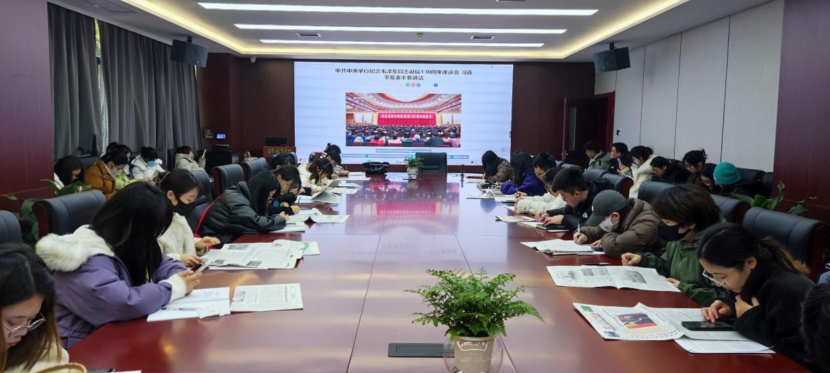 活动伊始,领学人通过播放视频素材向全体与会同学传达“中共中央举行纪念毛泽东同志诞辰130周年座谈会”的重要内容。习近平总书记强调,要把毛泽东同志开创的事业继续推进向前,以中国式现代化全面加快强国建设、推进民族复兴伟业。通过视频学习让同学们了解到,毛泽东思想是我们党的宝贵精神财富,毛泽东同志的崇高精神风范永远是激励我们继续前进的强大动力。