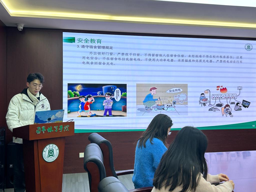 其次,王鹤冰同学重点强调了安全问题,要注意人身安全规范,增强网络安全意识,遵守宿舍管理,遵守离校请假手续。学生的人身安全是重中之重,必须要严格遵守和履行。