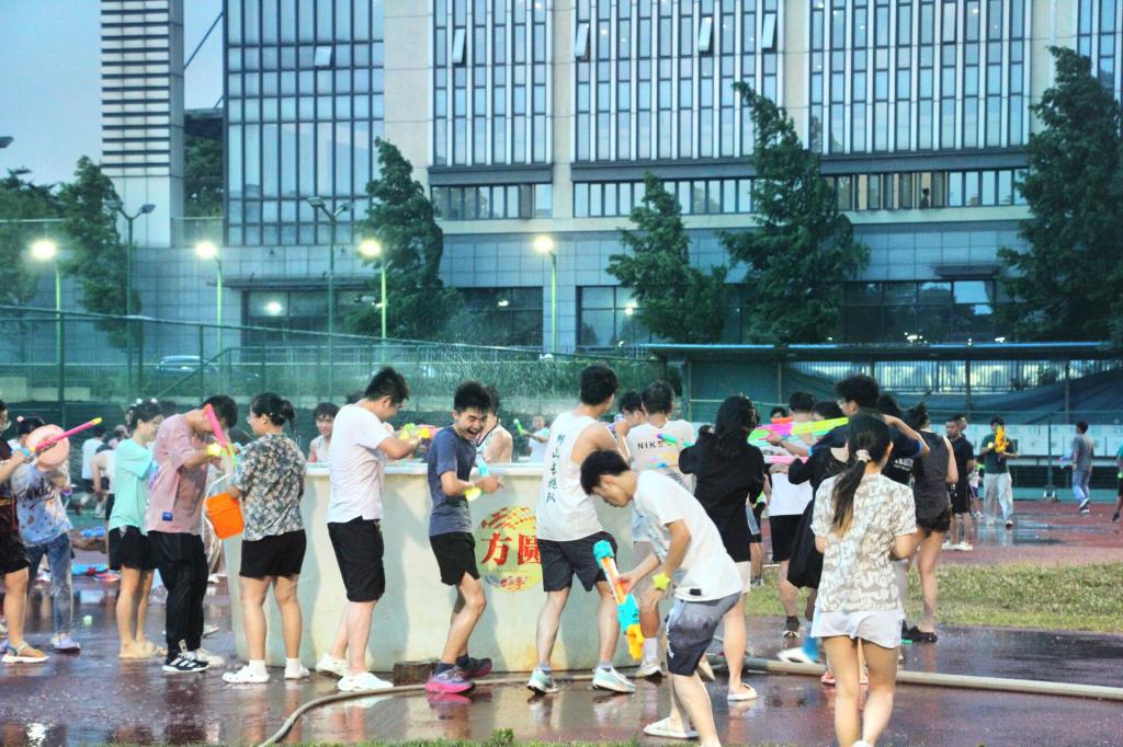 回到东运动场,“水枪大战”正蓄势待发。或持水枪,或端瓢盆,同学们使用着不同的“武器”互相“攻击”,追逐嬉戏,现场一片欢乐。校党委书记高翅与同学们打成一片,他和毕业生们合影留念,并送上最真挚的祝福。我院辅导员们向毕业生们送去一句句“毕业快乐!”,他们和我院学子相聚在一起,共同庆祝着毕业的到来。