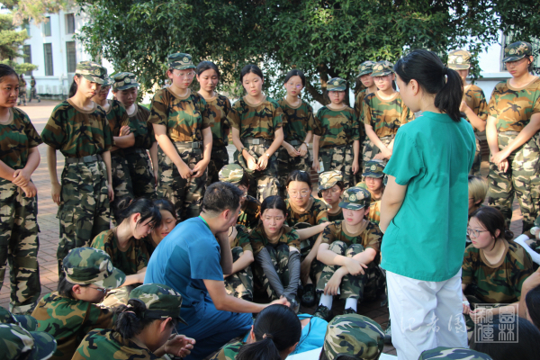 当天下午,24级新生军训开展了战地救护知识培训。来自中国人民解放军中部战区总医院和湖北省红十字会的应急救护教员们为同学们开展了急救创伤和心肺复苏知识培训和实操训练。教员们向同学们讲述并示范了心肺复苏、创伤包扎等动作要领。围在一旁的同学们翻看着应急救护知识的小册子,依据教员们讲解的操作要领,将理论与实践相结合,认真学习应急救护知识。