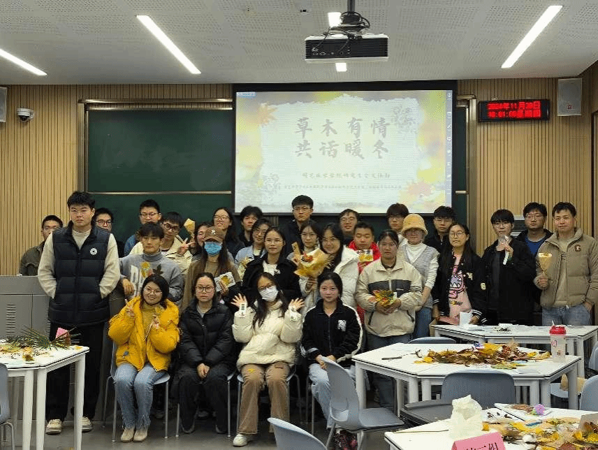 2024年11月28日下午14点,第一教学楼106教室内,微风拂过书页,金黄的银杏叶诉说着秋的余韵,以“草木有语,共话暖冬”为主题的活动在此温情启幕。这是一次自然与艺术的深情邂逅,也是初冬时节的一场暖心之旅。活动旨在通过“捡秋”、手工制作与趣味游戏,将自然的美好融入艺术创作,以温暖的氛围为繁忙的学习生活增添一份诗意与治愈。