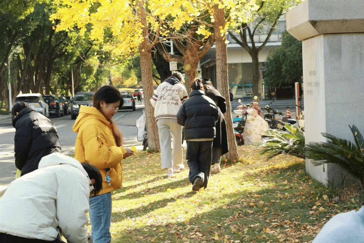 图1:学生们在金黄银杏树下拾叶,静享秋日的温暖与自然的馈赠。