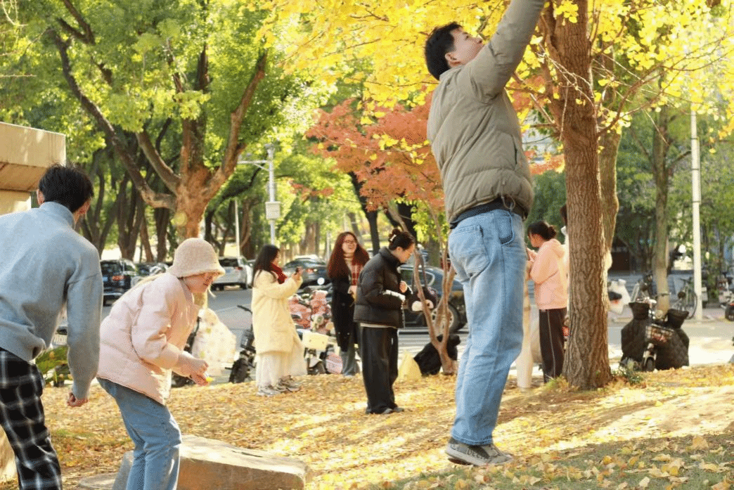 图2:阳光洒满树梢,学生们拾取银杏落叶,捕捉秋日的诗意瞬间。