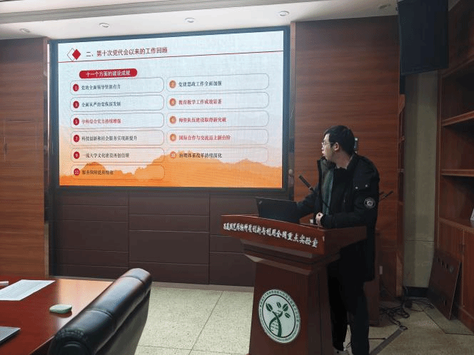 随后,熊志强同志带领支部成员研读了《加快建设特色鲜明世界一流大学的宣言书和动员令》,强调了第十一次党代会报告文件是指导学校未来五年发展的纲领性文件,是坚持走群众路线、充分发扬民主的文件。报告中提出,“到2035年,学校基本建成特色鲜明世界一流大学,进入世界一流行列,1-2个学科进入世界一流前列,3-5个学科进入世界一流行列,并全面阐述了学校内涵式高质量发展的整体战略布局。