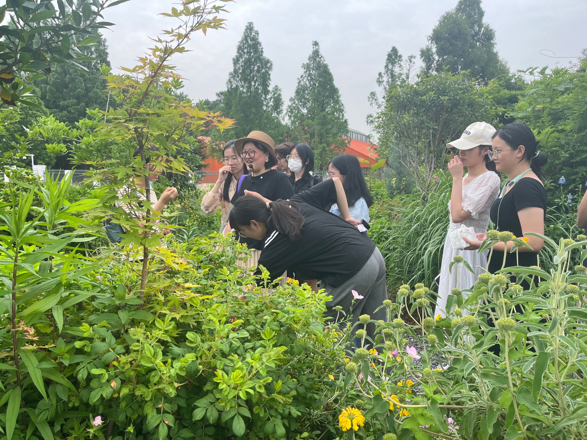王媛媛老师带领心理委员们走进花卉基地,在参观过程中,结合基地内的各种花卉植物,进行现场教学。她一边引导大家观察花卉的形态、颜色、气味,一边详细讲解每种花卉的生长习性、养护要点,以及与之相关的园艺操作技巧。她强调园艺疗法的重要价值,鼓励心理委员们将所学知识和体验运用到实际生活和工作中,帮助更多同学关注心理健康,通过园艺活动收获快乐与健康。