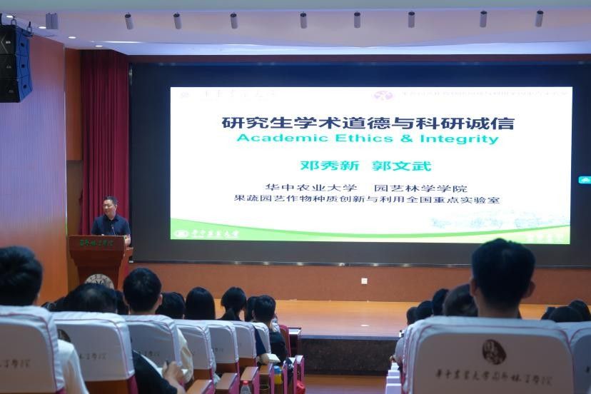 学科建设委员会主任郭文武教授代邓秀新院士发言,重点强调了科研诚信与学术规范的重要性。指出实事求是是科研工作的根本原则,必须坚持诚实守信、数据真实、记录规范。当前学术环境面临AI写作、重复发表、不当引用等多重挑战,要求每一位科研工作者时刻保持敬畏之心,坚守学术底线。