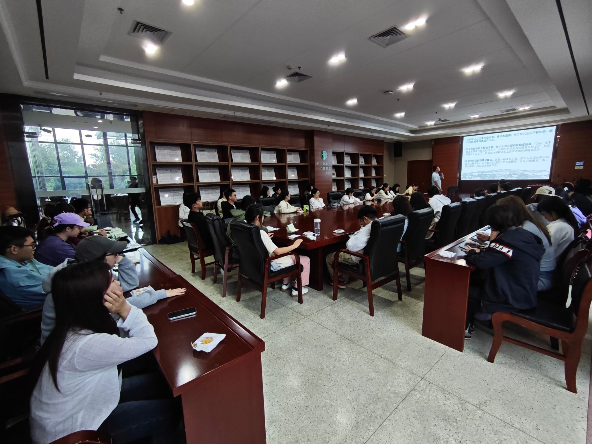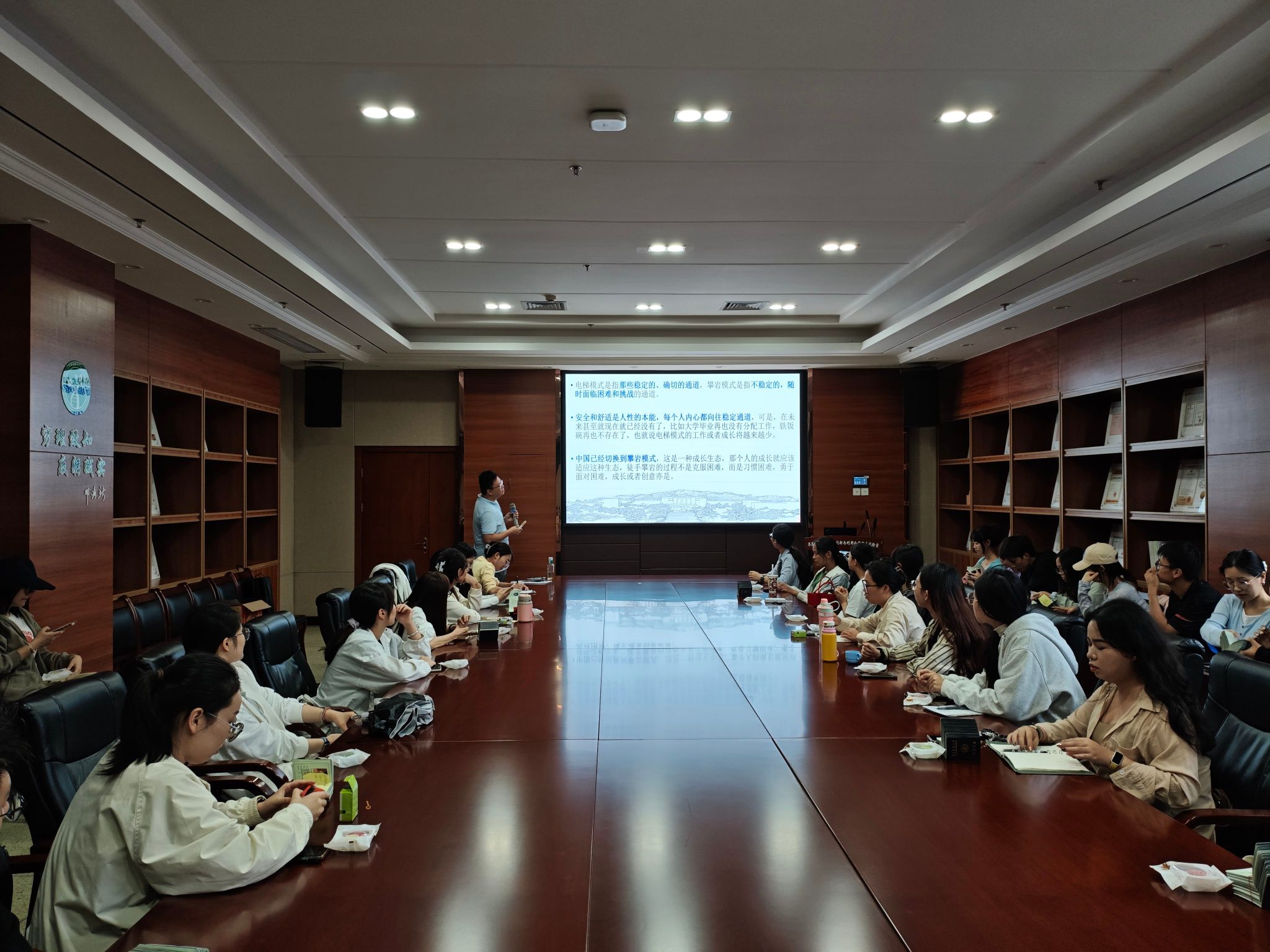 研讨会伊始,肖晗老师以"从电梯模式到攀岩模式"为核心比喻,生动阐述了当代研究生面临的挑战与机遇。他指出,研究生阶段不再是按部就班的"电梯",而是充满不确定性、需要主动探索的"攀岩"过程。这一转变亟需研究生班级建立“成长型发展式”新模式——从认识到熟悉再到认同,从联系到合作再到陪伴,这也要求研究生干部建立成长型思维,在科研与班级服务中锻炼综合能力。
