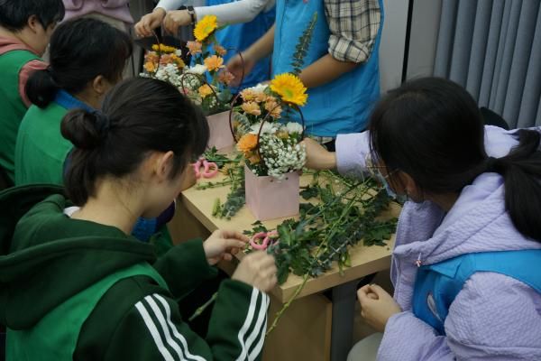 “现在就有请志愿者们为大家分发待会儿会用到的花材、花盒和花泥等材料吧,期待大家的作品哦!”黄灿灿的向日葵、温柔的康乃馨、俏皮的非洲菊......拿到花材的学员们在志愿者的引导下开始尽情创作。“这种手提式的插花作品呢,我们一般会欣赏它的四面,所以我们可以观察一下哪一面比较空,适当做一点补充。”志愿者耐心地为“大朋友”补充讲解,协助大家更好地完成作品,现场花香四溢,大家的创作热情也充斥着整个教室。