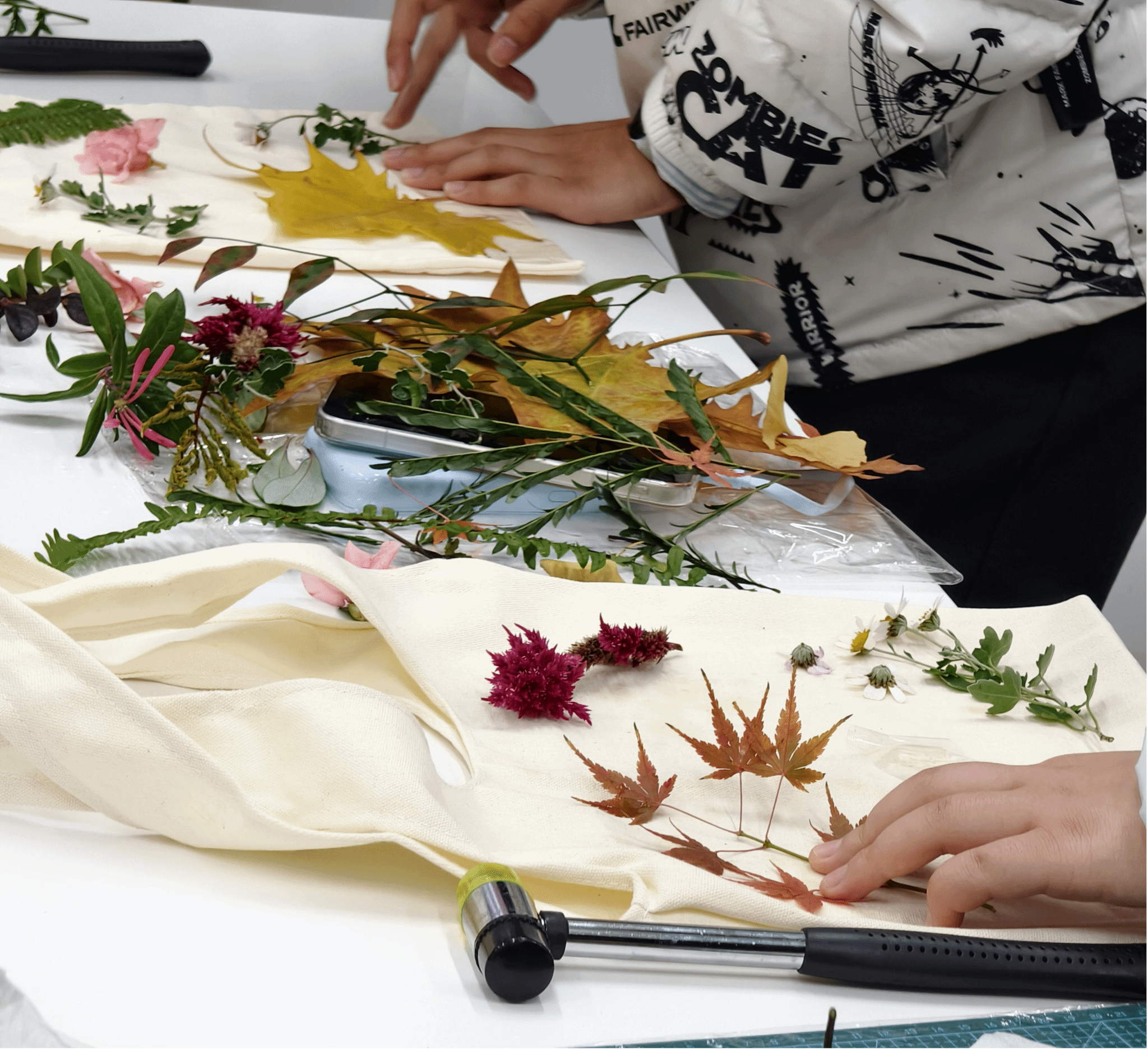 随后进入 “草木留影・拓印手作” 环节。植物拓染技艺借助植物的天然色素,复刻其独特形状,通过敲击将其精准复刻在布艺载体上。活动现场敲击声富有节奏,同学们通过一次次捶打,使植物细胞液中的色素与布料纤维充分融合,实现美感的永久定格。经过实践创作,原本平凡的布艺载体蜕变为承载自然灵气的艺术作品。