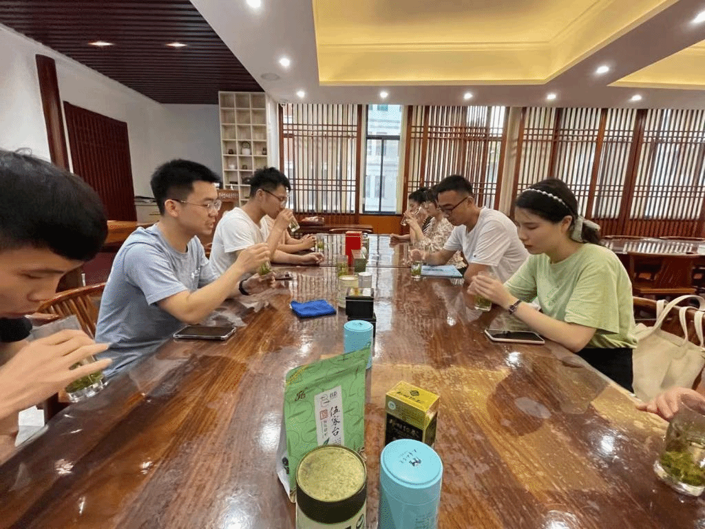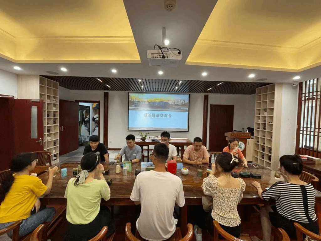 随后,大家一起坐下来品尝佳茗,本次交流会品饮的茶叶是黄山毛峰,作为中国十大名茶之一的黄山毛峰,是鲜叶采摘后经摊放、杀青、理条、干燥后制成的,是我国烘青绿茶的代表。黄山毛峰茶叶外形微卷,状似雀舌,白毫披身,芽尖峰芒,将干茶投入杯中,注入热水看茶叶在杯中旋转飞舞,又缓缓沉入杯底。看着这番景象让人不由自主地放松下来。