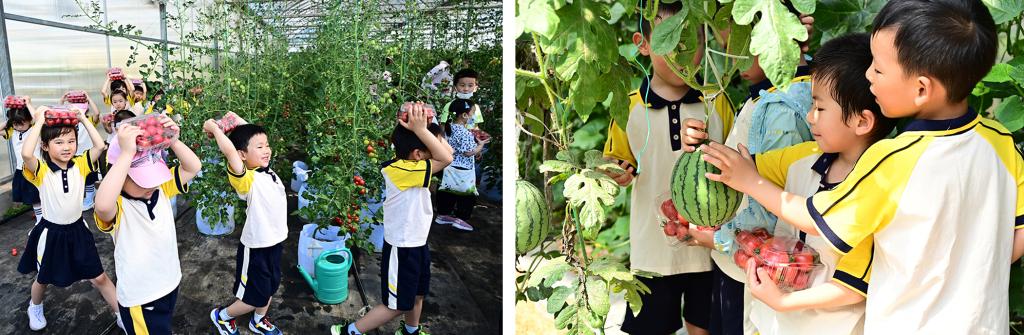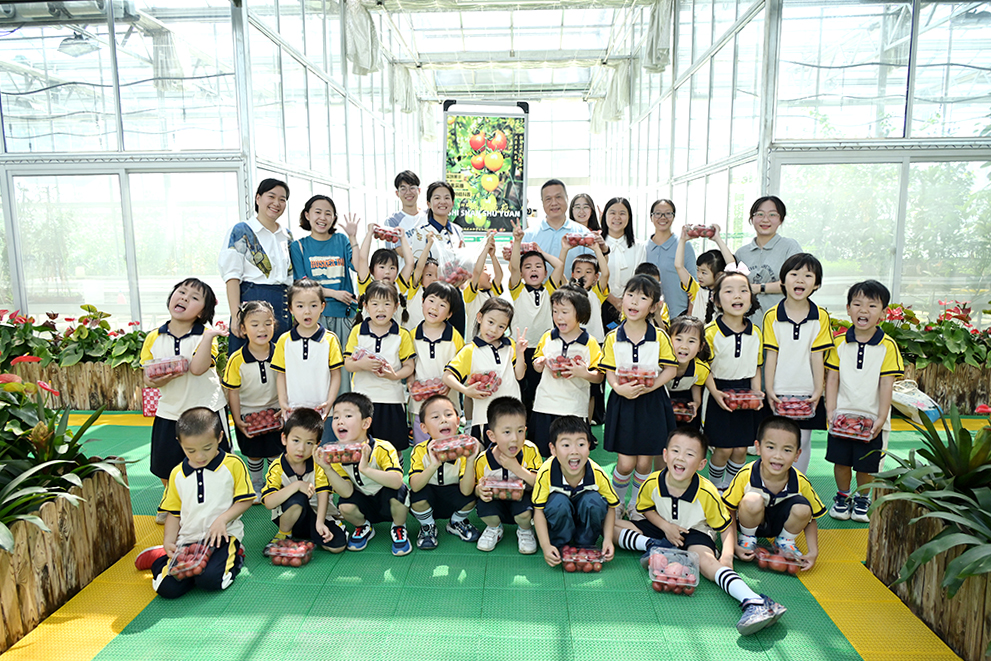 随后由设施农业科学与工程2002班的同学们分发采摘盒,幼儿园小朋友们就开始穿梭于红彤彤的番茄之间开始采摘。这届种植的番茄有大型番茄和小型番茄两种类型,小朋友们对大番茄情有独钟,很多小朋友即使满头大汗,依然乐此不疲地在番茄园中进行采摘。