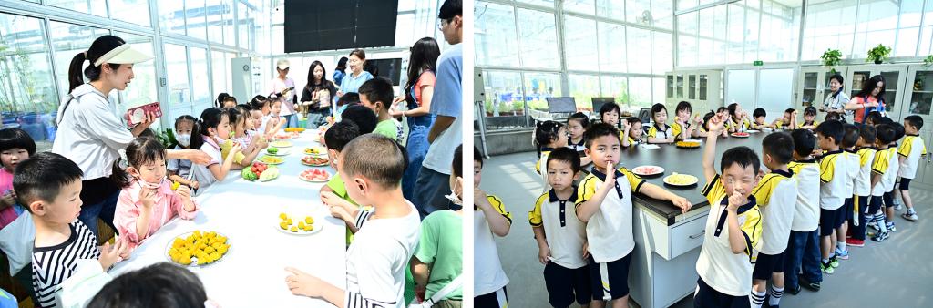 采摘之后,幼儿园师生进入智慧温室,肖慧玲老师给大家介绍了智慧温室不同作物的栽种情况,目前温室里种植有果菜花大概10几个品种的园艺作物,不同课题组老师将重要的种质资源保存在温室,智慧温室可以为各种不同的植物材料创造适宜的生长环境,温室采用智慧化管理,智能控温、浇水、施肥,减少了劳动力的成本。