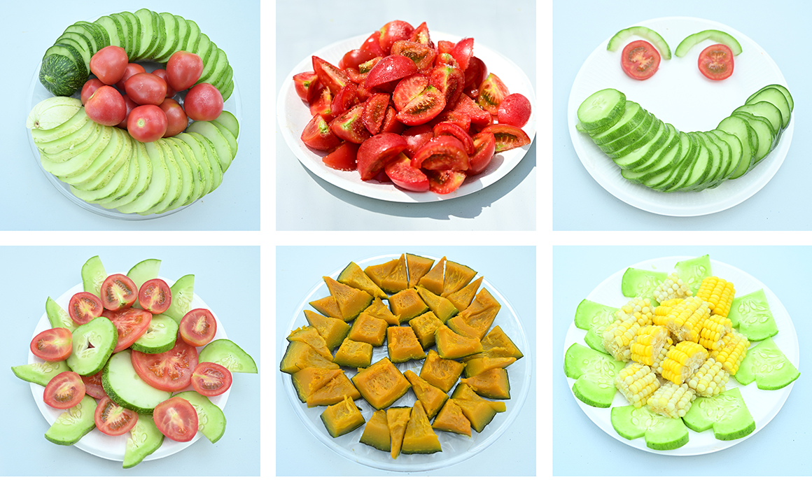 随后设施农业科学与工程2002班的同学们利用自己种植的南瓜、黄瓜、西瓜、水果玉米、番茄等,制作了许多甜美可口的蔬果食品,样式新颖、颜色丰富的蔬菜拼盘让小朋友们食欲大开、大家争先恐后地品尝各种食物,颜色不同的园艺作物按照不同的方式摆放,辅之以白砂糖,不一会就被小朋友们一抢而光。