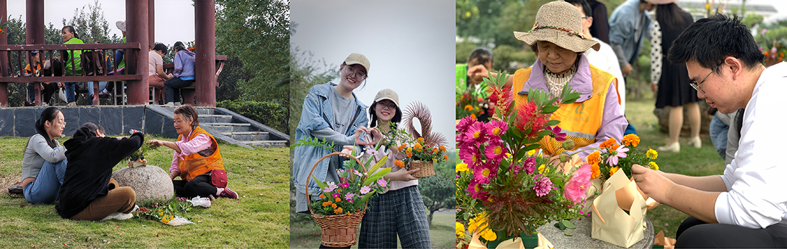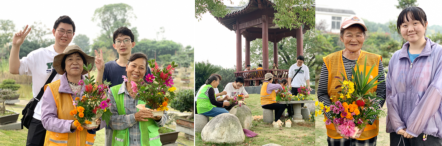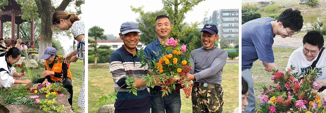 从采摘到插花的整个过程,每个人脸上都洋溢着快乐的笑容。简单的园艺体验活动拉近了学生们与环卫工作者的心,即便素昧平生,但动人的鲜花和优美的自然环境却让大家其乐融融。