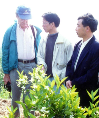 1997年5月,郭文武(中,在读博士生)受邓秀新教授委派,陪同美国佛罗里达大学教授、国际柑橘学会前主席Gene Albrigo博士前往秭归调研柑橘产业